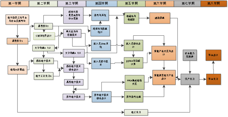 电路分析基础、模拟电子技术、数字电子技术、单片机与传感器、信号与系统、通信原理、嵌入式接口技术、嵌入式实时系统、数字信号处理、嵌入式Linux系统、Python与边缘计算。