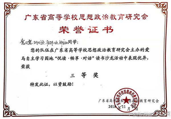 11月10日,由广东省高等学校思想政治教育研究会主办、华南理工大学马克思主义自主学习行动园地承办的“悦读·畅享·对话”读书沙龙活动在华南理工大学顺利举办,我校马克思主义学院选派了2016级英语7班邓文玲、2016级工程管理班谢卓昂和2016级财务管理1班黄凤霞、2017级工商管理1班杨陈顺等同学分别组成红星队和忠诚队参加了此次活动,均获三等奖。