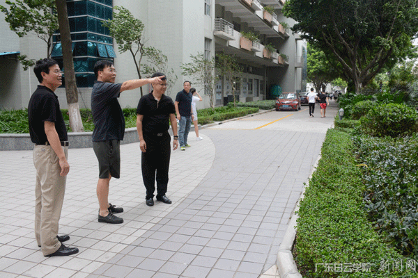 校长黄大乾(左二)、党委书记刘剑锋(左一)、校长助理肖军田(左三) 巡查校园