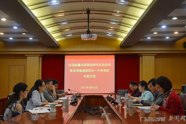 刘跃南副校长对来访的宾客表示热烈的欢迎,并向来宾介绍了我校的发展历史和学校特色。鲁建新局长介绍了来访的目的,表明此行主要考察我校先进的办学理念和办学特色,由此参考在可克达拉市创办职业教育高等院校的可行性。随后,双方围绕学校组织构架和运作模式进行了深入探讨。