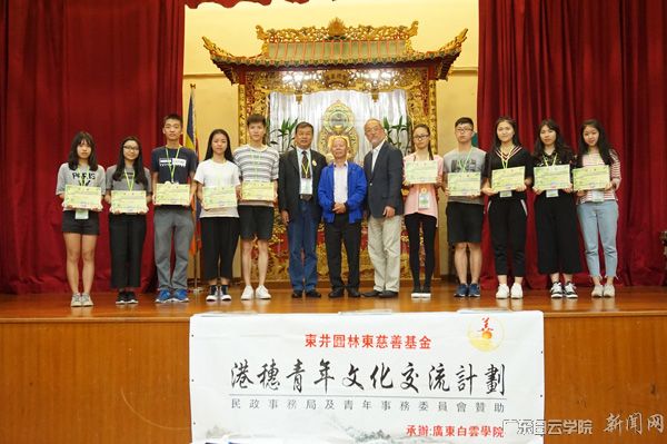 在广东省侨务办公室、香港民政事务局和香港青年事务委员会的支持下,由香港东井圆林东慈善基金主办和广东白云学院承办的2016港穗青年文化交流活动顺利结束。10月23日~25日,广东白云学院教授、30名学生香港进行了三天的交流。本次活动的主题是“感恩国家、感恩社会、感恩父母”,旨在帮助港穗两地学生更好地了解香港和祖国的传统文化、历史和经济社会发展情况,体验“一带一路”和“一国两制”国策的优越性。香港30名学生和4名教师曾于今年7月来广东白云学院进行了3天的交流活动。