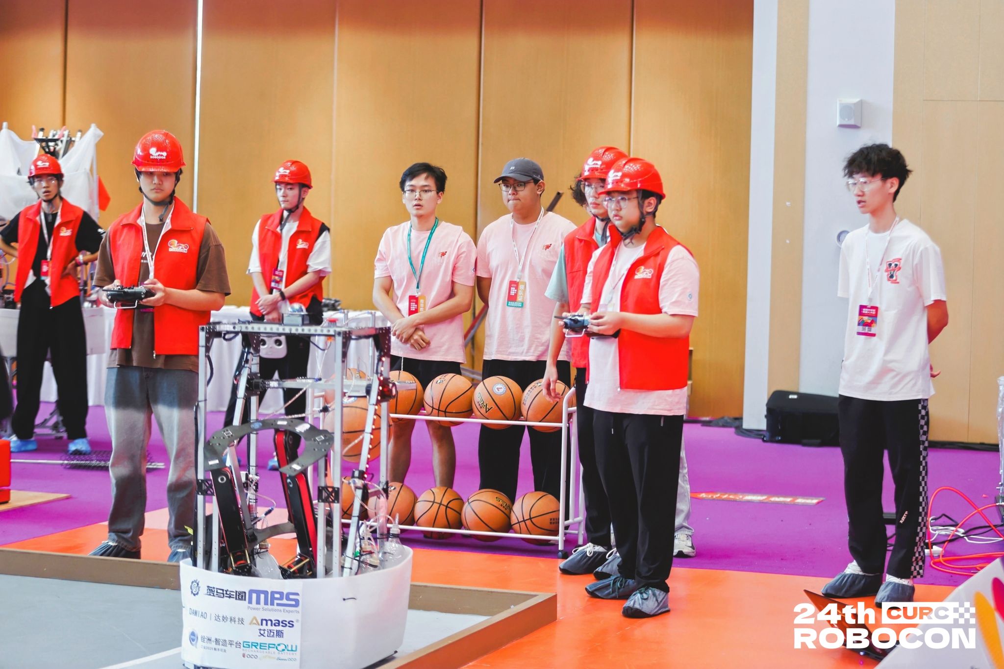 积分选拔赛需在3分钟内完成随机7点投篮与固定7点运球,按总分排名晋级;对抗淘汰赛时长180秒,进攻方须在20秒持球时间内运球突破防守,于2分或3分区投篮或扣篮得分(运球1次1分,上限2分;2分区进球2分;3分区进球3分;扣篮成功7分)。该项目全面考验机器人的硬件设计、软件算法及团队协作与战术能力。
