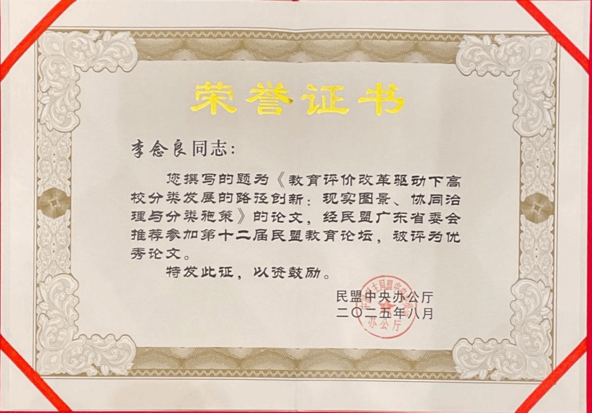 李念良老师的研究论文以《深化新时代教育评价改革总体方案》五年实践为依托,聚焦教育评价改革核心议题,精准把握高校分类发展的理论脉络与现实难题,提出的创新路径为高等教育差异化发展注入新思考。近30年来,从民办高校教育一线到参政议政舞台,李念良老师始终身兼“教育者”与“履职者”双重身份:既全心投入教学改革与人才培养,又以政协委员、民盟干部等身份积极发声、服务社会,多项工作成果获广泛认可。此次斩获民盟中央教育论坛优秀论文,既是对他学术能力的肯定,也是对其参政议政成效的褒奖。面对荣誉,李念良老师表示将不忘初心,持续以专业所长赋能人才培养与社会发展。(图文/教学质量监测与评估中心彭文健,部分内容来自人民网 责任编辑曾进)