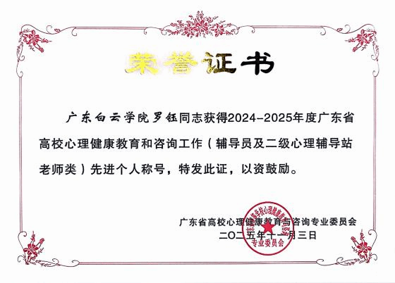 近日,广东省高校心理健康教育与咨询专业委员会正式公布2024-2025年度工作评优结果。经严格评审,广东白云学院心理健康教育与咨询中心凭借扎实的心理专业体系建设和显著的育人成效,荣获“广东省高校心理健康教育与咨询工作先进集体”称号。