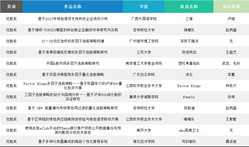 《基于线性得分与机器学习信号融合的多因子选股策略》(队伍:因子掘金队,指导教师:陈梅莲)。