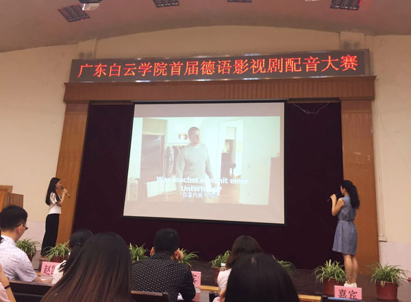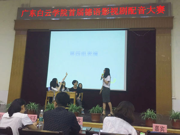 5月5日晚,由外国语学院德语系举办的广东白云学院第十九届科技创新节之首届德语配音比赛在儒学堂举行。本次比赛由德语系赵凯主任、外教妮可拉、向绍英老师担任评委,学院团委书记梅俊强、外教金到延在现场观摩了比赛。