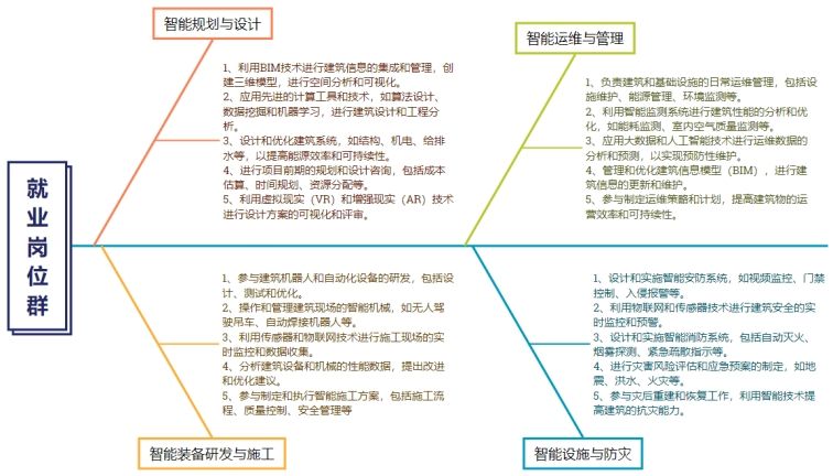 毕业生可进入设计院、施工企业、智能建造高新技术企业,聚焦智能规划和设计、智能装备研发、智能运维管理、智能防灾四大就业群,从事智能规划、数字化施工管理、建筑机器人运维等工作;学生亦可根据自身规划继续深造-考研究生、出国留学深造、报考公务员、报考国家注册建造师、BIM工程师、国家注册造价师等10余种专业证书。