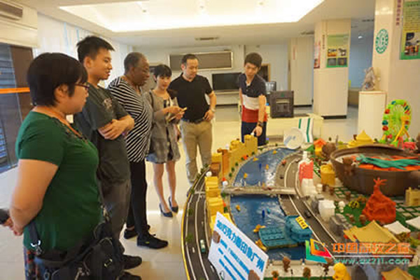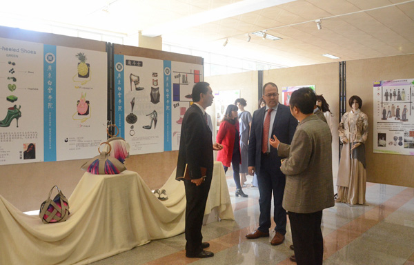 董事长谢可滔(左一)陪同来宾参观我校学生创新创意作品展