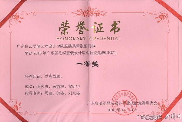 11月3日,2016年广东省毛织服装设计职业技能竞赛在大朗落幕,我校艺术设计学院2014级服装设计与工程专业陈家珍、黄淑根、龙昕宇三位同学荣获团体组一等奖,2015级产品设计专业(服装设计方向)陈建达、李玉翠、吴妍珊三位同学荣获团体组二等奖,服装系郭艳老师、周建老师、刘凡嘉三位老师荣获优秀指导老师奖。